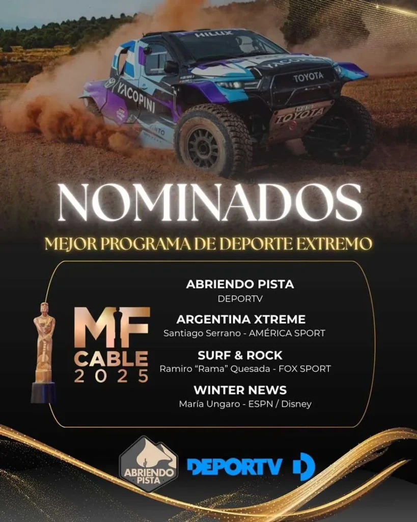 El programa “Abriendo Pista”, emitido por DeporTV, fue nominado a los Premios Martín Fierro Cable 2025 en la categoría Mejor Programa de Deporte Extremo, un reconocimiento que reafirma su crecimiento y su fuerte inserción en el mundo del deporte motor.