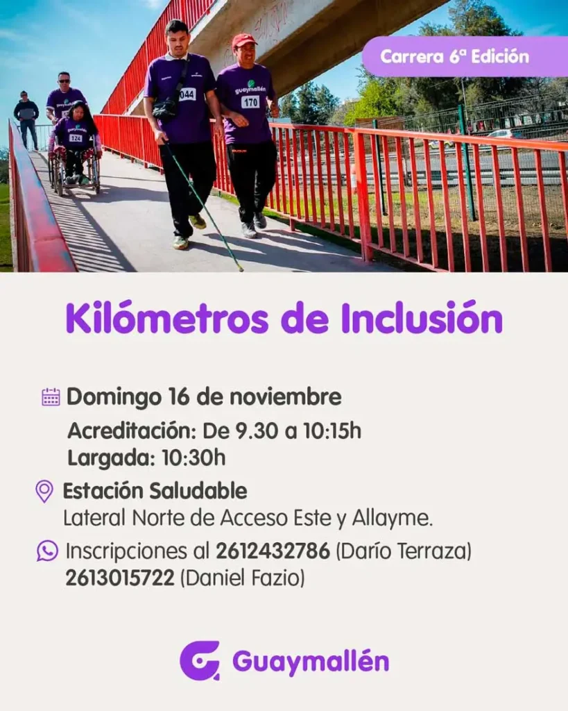 La Municipalidad de Guaymallén organiza la sexta edición de la carrera “Kilómetros de Inclusión”, que se llevará adelante el domingo 16 de noviembre, desde las 9.30 horas. El punto de partida será la Estación Saludable del Parque del Acceso Este (Lateral Norte de Acceso Este y Allayme, contiguo al predio de la Virgen, distrito Nueva Ciudad).