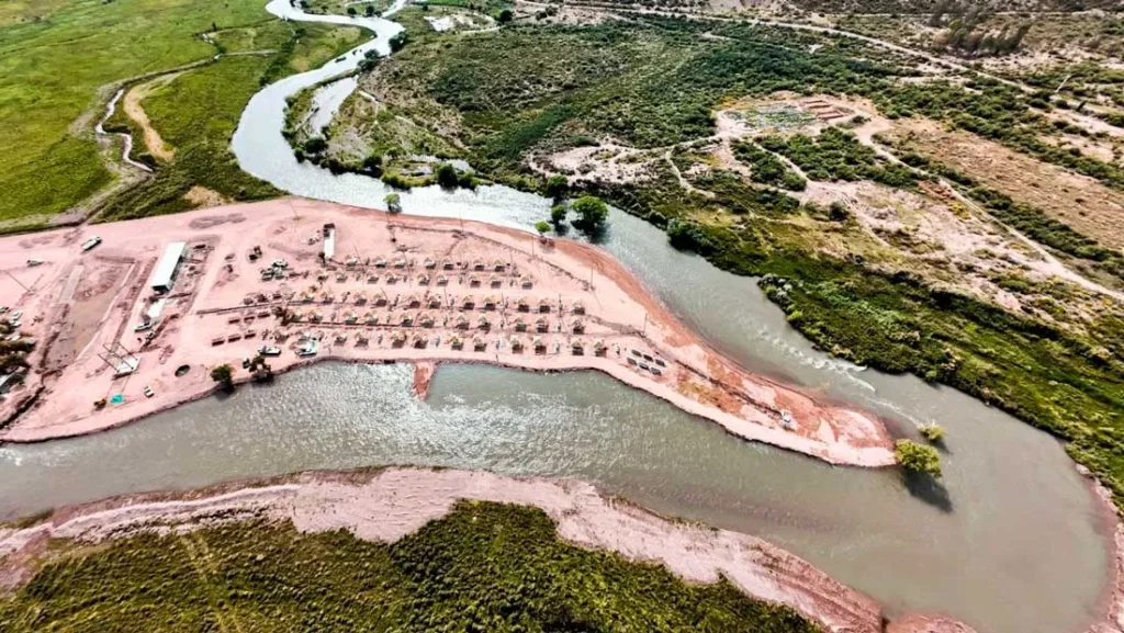 El drone sobrevoló el enorme predio que adaptó el Municipio sobre las tierras bañadas por el río Atuel, a metros de la ruta nacional 143. Al lugar se accede por calle Las Areninas, que también está siendo acondicionada para el tránsito de quienes lleguen en vehículo.
