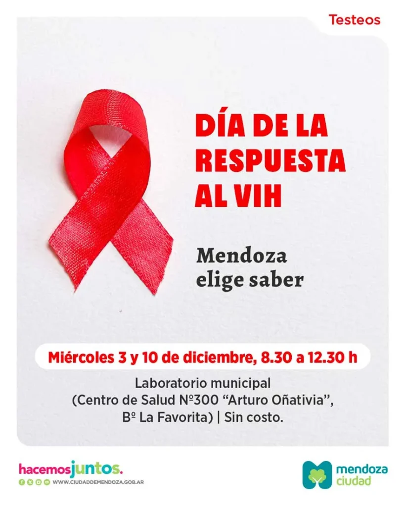 En el marco del Día de la Respuesta al VIH, que se conmemora mundialmente cada 1 de diciembre, la Ciudad de Mendoza se adhiere a la campaña activa 2025 “Mendoza Elige Saber”, organizada por el Programa Provincial de Respuesta al VIH. La iniciativa busca promover el acceso a información confiable, prevención y diagnóstico temprano, acercando los servicios de salud a los vecinos y vecinas.