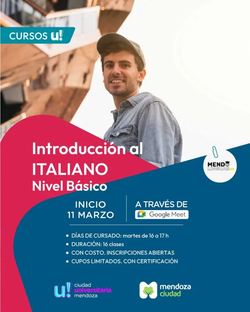 Por otra parte, Ciudad Universitaria, en colaboración con el Instituto Mendolinguasbr, abrirá las inscripciones para el Curso de Introducción al Italiano Nivel Básico, una propuesta destinada a personas sin conocimientos previos del idioma.