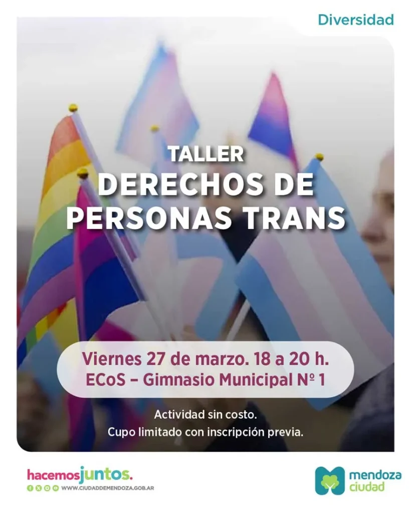 El viernes 27 de marzo, de 18 a 20 horas, se realizará el taller “Derechos de personas trans” en el ECoS (Paso de los Andes y Sobremonte, Gimnasio Nº1). La propuesta está destinada a la población transgénero y se desarrollará en el marco del Día de la Promoción de los Derechos de las Personas Trans (18 de marzo) y del Día de la Visibilidad Transgénero, Travesti y Transexual (31 de marzo).