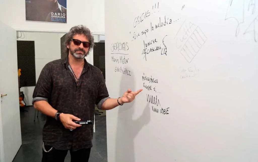 Aprovechando su estadía en la provincia, fue invitado también a conocer la sede de la Escuela Municipal de Rock Mario Mátar, única en su tipo en Mendoza, que está ubicada en la explanada del Espacio Cultural Julio Le Parc. Allí, recorrió las instalaciones acompañado por el subsecretario de Cultura de la Provincia, Diego Gareca, y la directora de Cultura y Turismo de Guaymallén, Carolina Vico. Además, dejó su firma grabada en una de las paredes del establecimiento en la que también otros músicos destacados han dejado su marca.