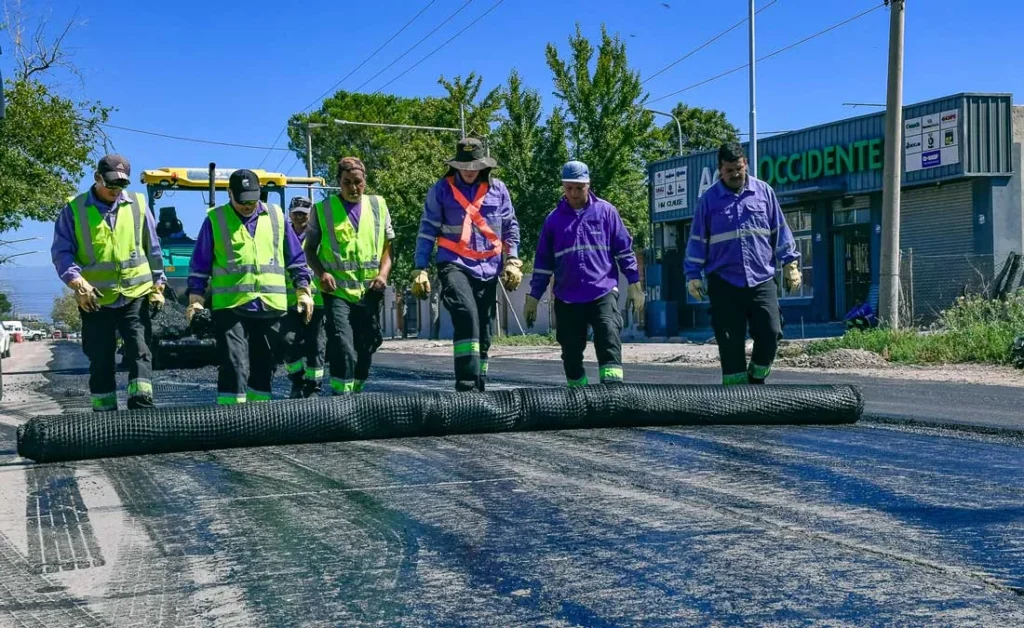 Los trabajos comenzaron con el sellado de fisuras existentes y la colocación de una geogrilla. El novedoso material es un geocompuesto de última generación que se utiliza para el reencarpetado. El mismo está conformado por un geotextil de base y una geogrilla que combinados permiten absorber las tensiones y deformaciones de la calzada.