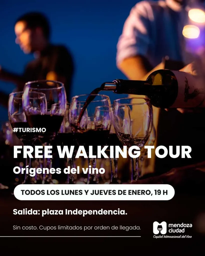 La Ciudad de Mendoza invita a participar de la actividad “Free Walking Tour: Orígenes del Vino”. Se trata de una propuesta gratuita que se realizará todos los lunes y jueves del mes de enero a las 19 h, y que pone en valor la identidad vitivinícola local en el marco de su distinción como Capital Internacional del Vino.