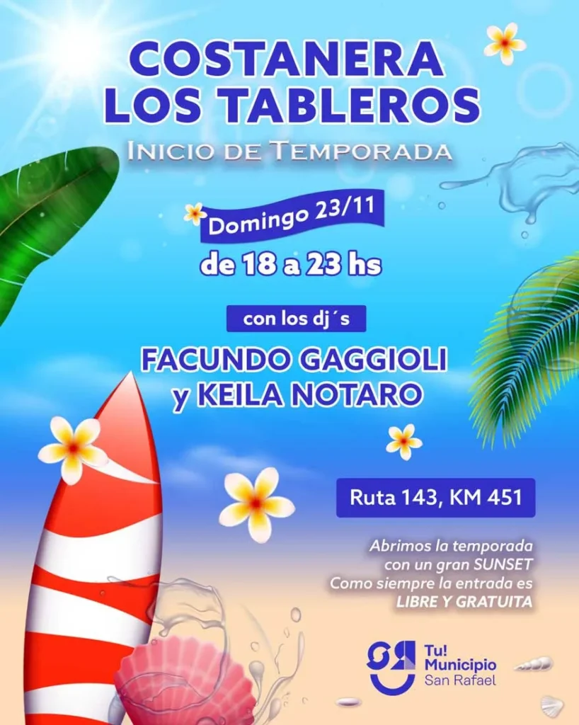 Este domingo 23, la Costanera de Los Tableros dará inicio formal a su temporada con una propuesta pensada para vecinos y turistas: un gran sunset a orillas del río Atuel, con DJ en vivo y entrada libre y gratuita.