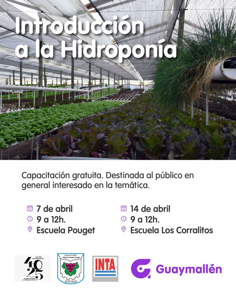La Municipalidad de Guaymallén invita al curso Introducción a la Hidroponía, que se realizará en dos sedes: el 7 de abril en la escuela Miguel Pouget y el 14 de abril en la escuela 4-025 Los Corralitos.
