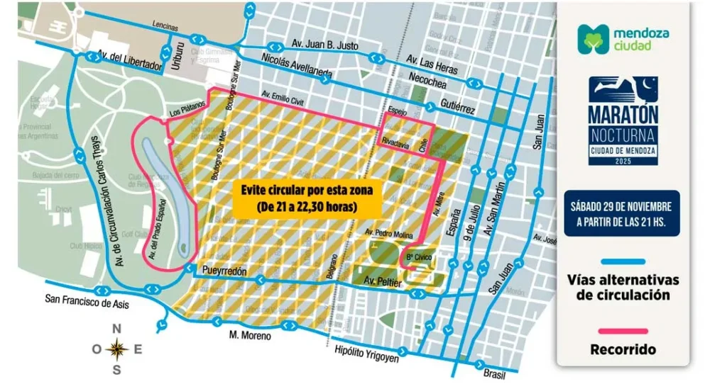 Las arterias que tendrán cortes totales, a partir de las 21, serán aquellas por donde circule la maratón: Mitre, Espejo, Sarmiento, Emilio Civit, Rivadavia e inmediaciones del lago del parque San Martín. En tanto que en el cruce con sus calles transversales, los cortes serán intermitentes.