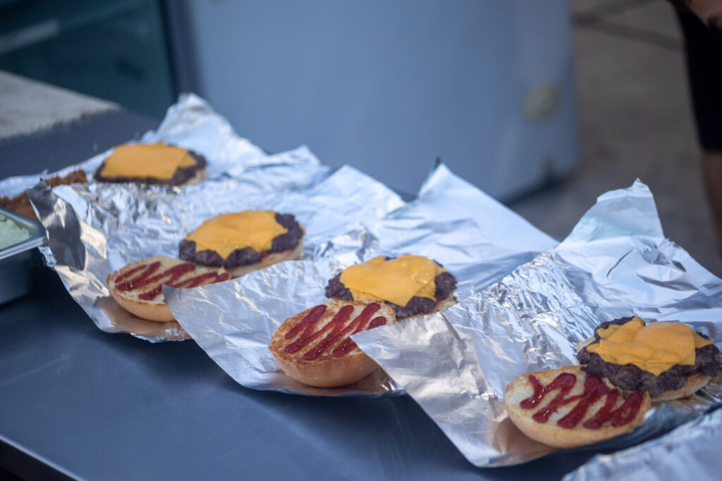 La escena fue tan competitiva como divertida: ambos chefs cocinaban mientras bailaban, generando aplausos y risas entre quienes seguían cada movimiento desde el predio. Una vez finalizado el tiempo, las hamburguesas fueron presentadas al jurado para la degustación final.