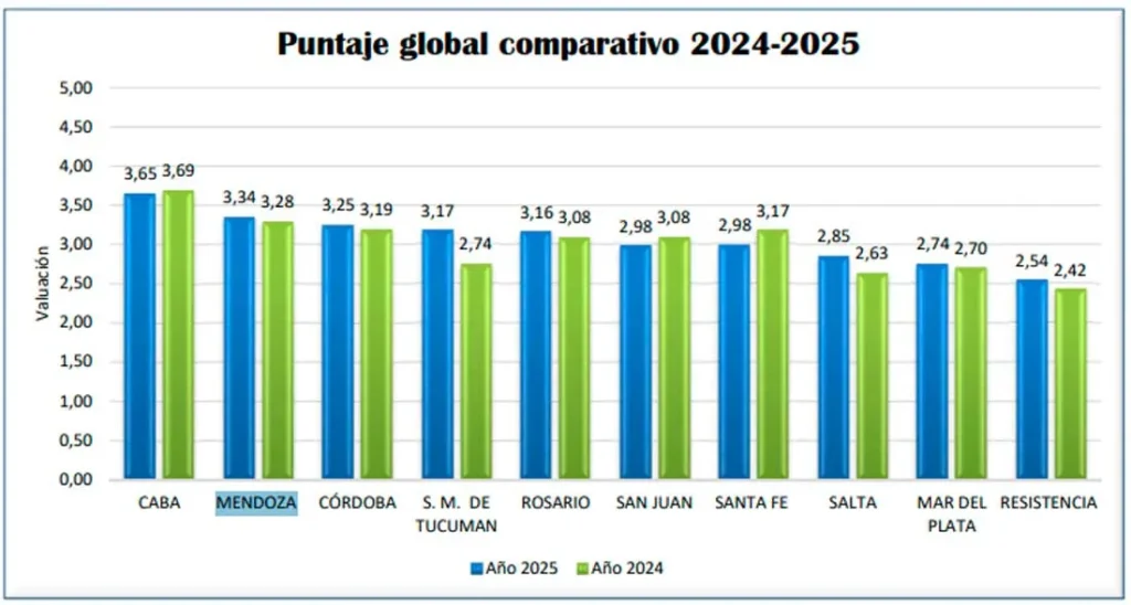 Esta valoración externa se suma a los resultados del Índice de Gestión Estratégica de Ciudades (IGEC) 2025, informe técnico elaborado por el Centro de Ciudades Inteligentes de la Facultad de Ciencias Económicas de la UBA. El documento -que estudia a los diez conglomerados urbanos más importantes de la Argentina– posiciona a Mendoza como la segunda ciudad del país en desempeño global, con un puntaje de 3,34, por detrás de la Ciudad Autónoma de Buenos Aires.