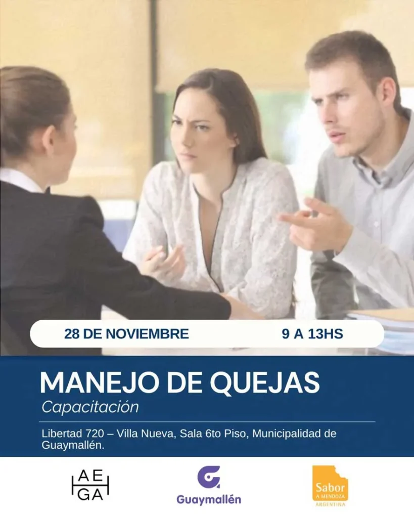 La Municipalidad de Guaymalllén, en coordinación con AEHGA, organiza una nueva capacitación gratuita relacionada al servicio de atención al cliente. Será el viernes 28 de noviembre, de 9 a 13h, en el salón del sexto piso del edificio municipal (Libertad 720, Villa Nueva).