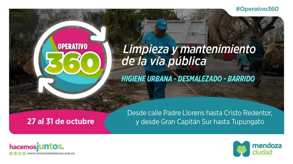 La Ciudad de Mendoza informa que, ha dispuesto acciones de higiene urbana en un sector del barrio San Martín, ubicado al oeste de Capital. La zona incluye desde calle Padre Llorens hasta calle Cristo Redentor y desde calle Gran Capitán Sur hasta calle Tupungato, perteneciente al citado barrio. Con estas acciones, se busca generar las condiciones adecuadas para los vecinos y vecinas de este sector del departamento.
