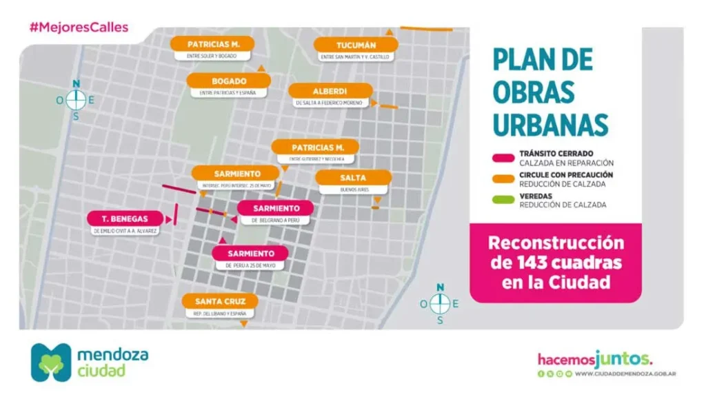 La Ciudad de Mendoza, en el marco del Plan de Obras Urbanas, informa el estado actual de las calles que se encuentran con trabajos de reconstrucción de calzadas y mejoras en veredas. Este plan prevé la renovación integral de distintas arterias y espacios públicos, según un cronograma de obras estratégicas para mejorar la transitabilidad y la infraestructura urbana.