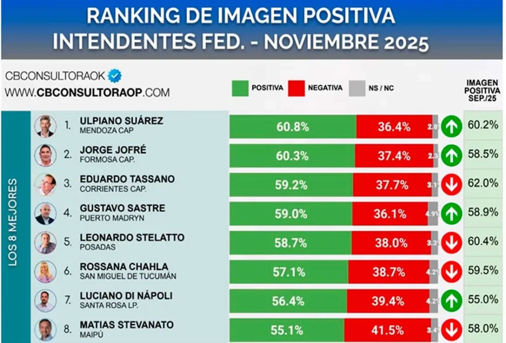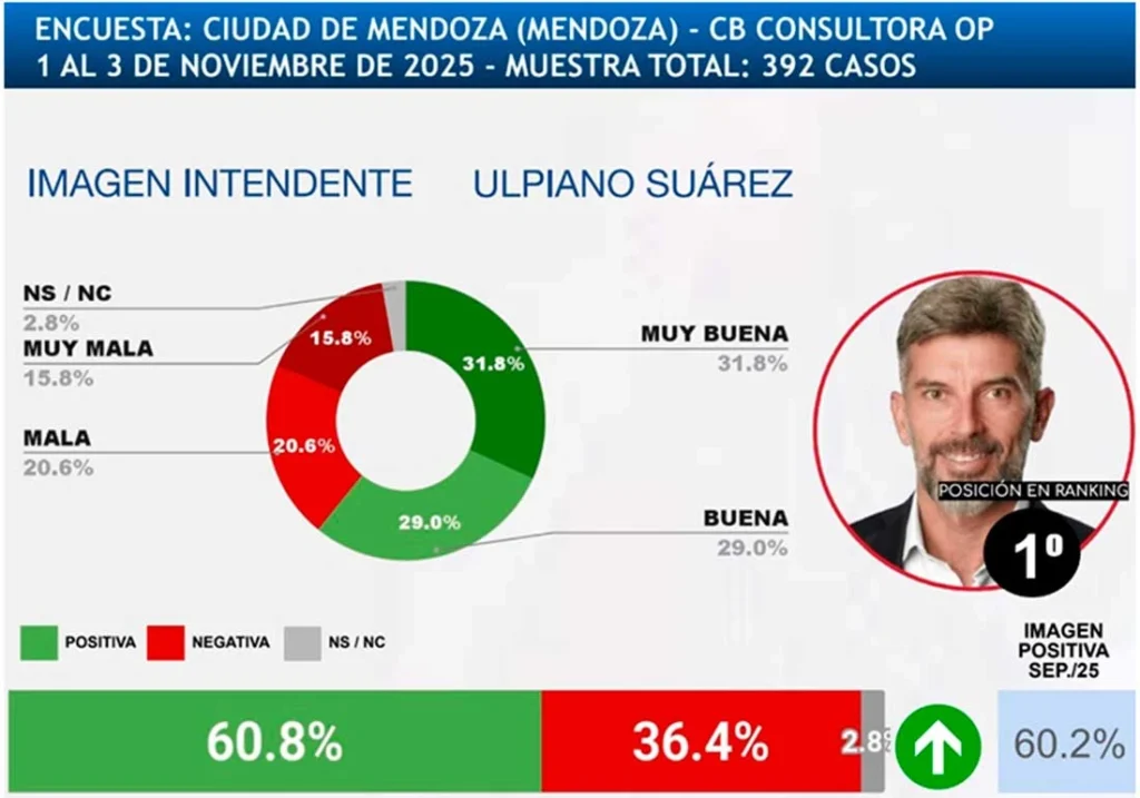El estudio, realizado entre el 1 y el 3 de noviembre de 2025 sobre una muestra de 392 casos en la Ciudad de Mendoza, reveló que un 31,8% calificó su imagen como “muy buena” y un 29% como “buena”. Este resultado posiciona a Ulpiano Suarez como el intendente con mayor valoración positiva del país, en un mes atravesado por el contexto pos electoral.
