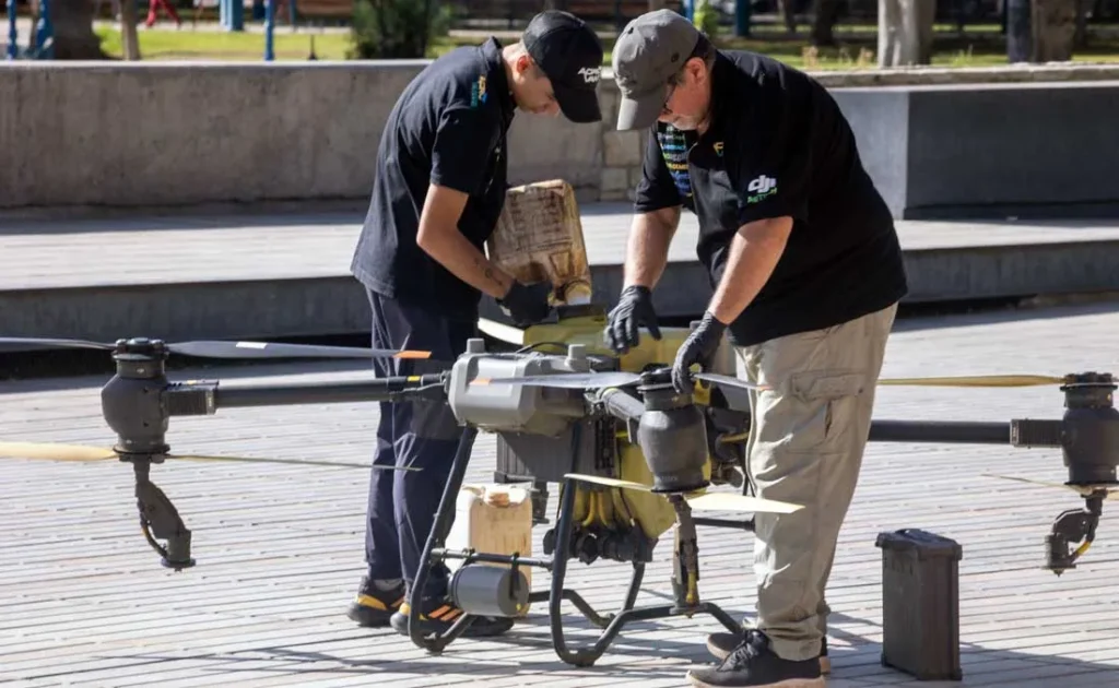 Concretamente, el operativo se orientó a mitigar la plaga conocida como Psilido, que afecta a las tipas y genera secreciones azucaradas que provocan un “pegote” en veredas y calzadas, dificultando el disfrute de las plazas. La intervención se ejecutó con equipos alquilados a la empresa mendocina Agro Vants, utilizando productos orgánicos autorizados para uso urbano. La pulverización con drones es un sistema completamente innovador y sustentable con amplios beneficios respecto al tradicional.