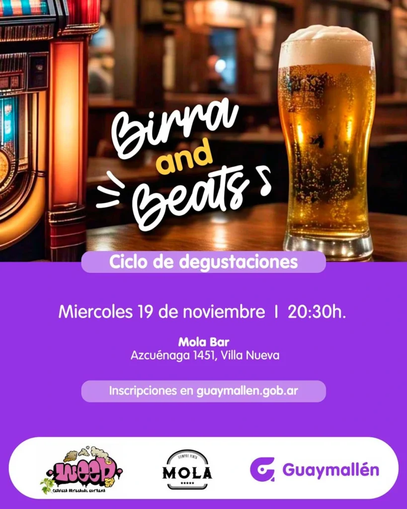 La Municipalidad de Guaymallén organiza una nueva edición del ciclo de degustaciones de cerveza artesanal “Birra and Beats”. El encuentro será el próximo 19 de noviembre, a las 20:30h, en Mola Bar (Azcuénaga 1451 de Villa Nueva).