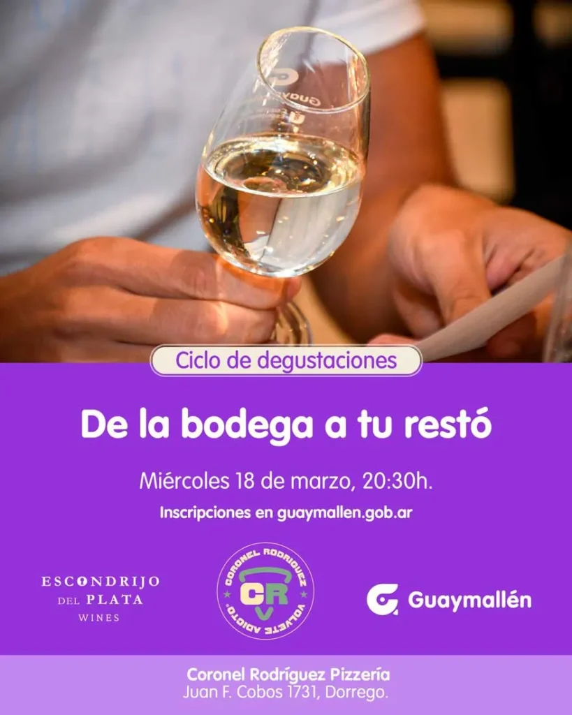 La Municipalidad de Guaymallén invita a los vecinos del departamento a participar de una nueva edición del ciclo de degustaciones “De la bodega a tu restó”, que se llevará a cabo el próximo miércoles 18 de marzo, a las 20:30h, en el Restaurant Coronel Rodríguez Pizzería, ubicado en Juan F. Cobos 1731, de Dorrego.