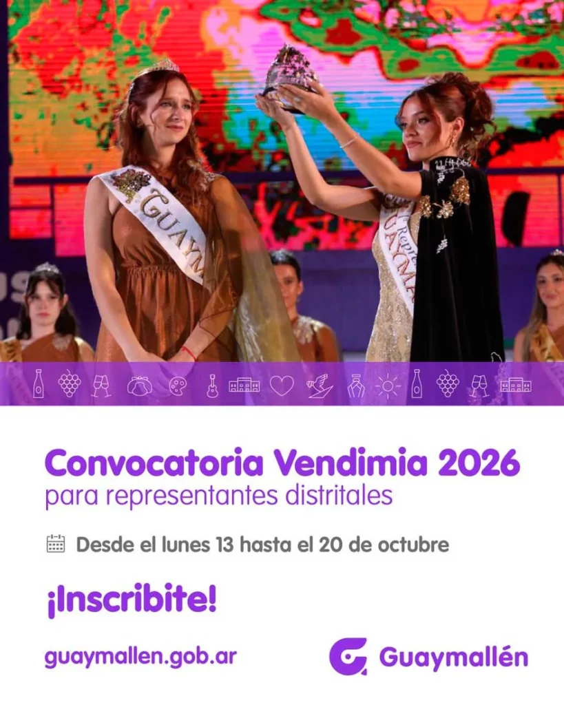 La Municipalidad de Guaymallén informa que desde este lunes hasta el 20 de octubre se abre la convocatoria para las personas interesadas en postularse como representantes distritales de la Vendimia 2026.