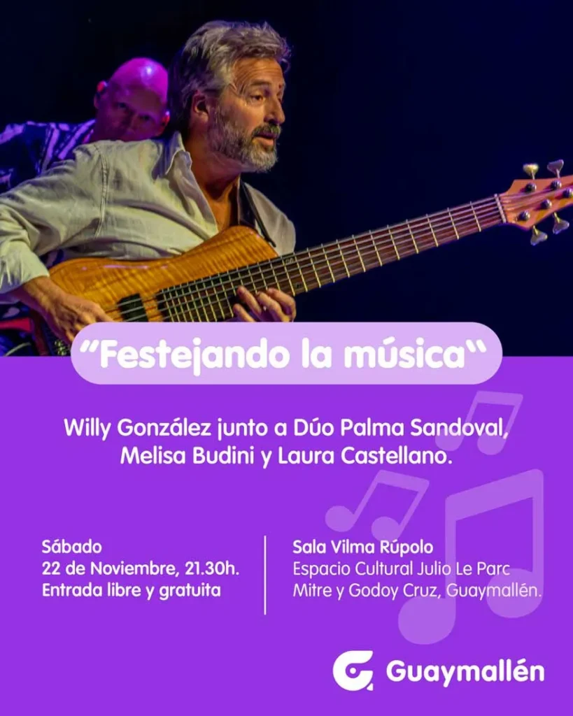 La Municipalidad de Guaymallén invita a disfrutar del concierto “Festejando la música”, una velada única protagonizada por el reconocido bajista argentino Willy González, junto al Dúo Palma Sandoval, Melisa Budini y Laura Castellano.